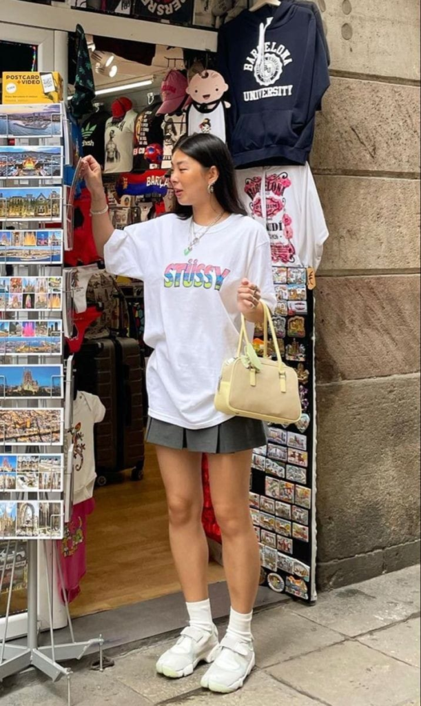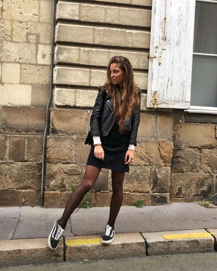 A combinação de saia e tênis mistura sofisticação e conforto. A saia traz um toque feminino e elegante, enquanto o tênis adiciona uma vibe casual e moderna, criando um visual descomplicado e estiloso. Ideal para quem busca um look versátil e confortável.